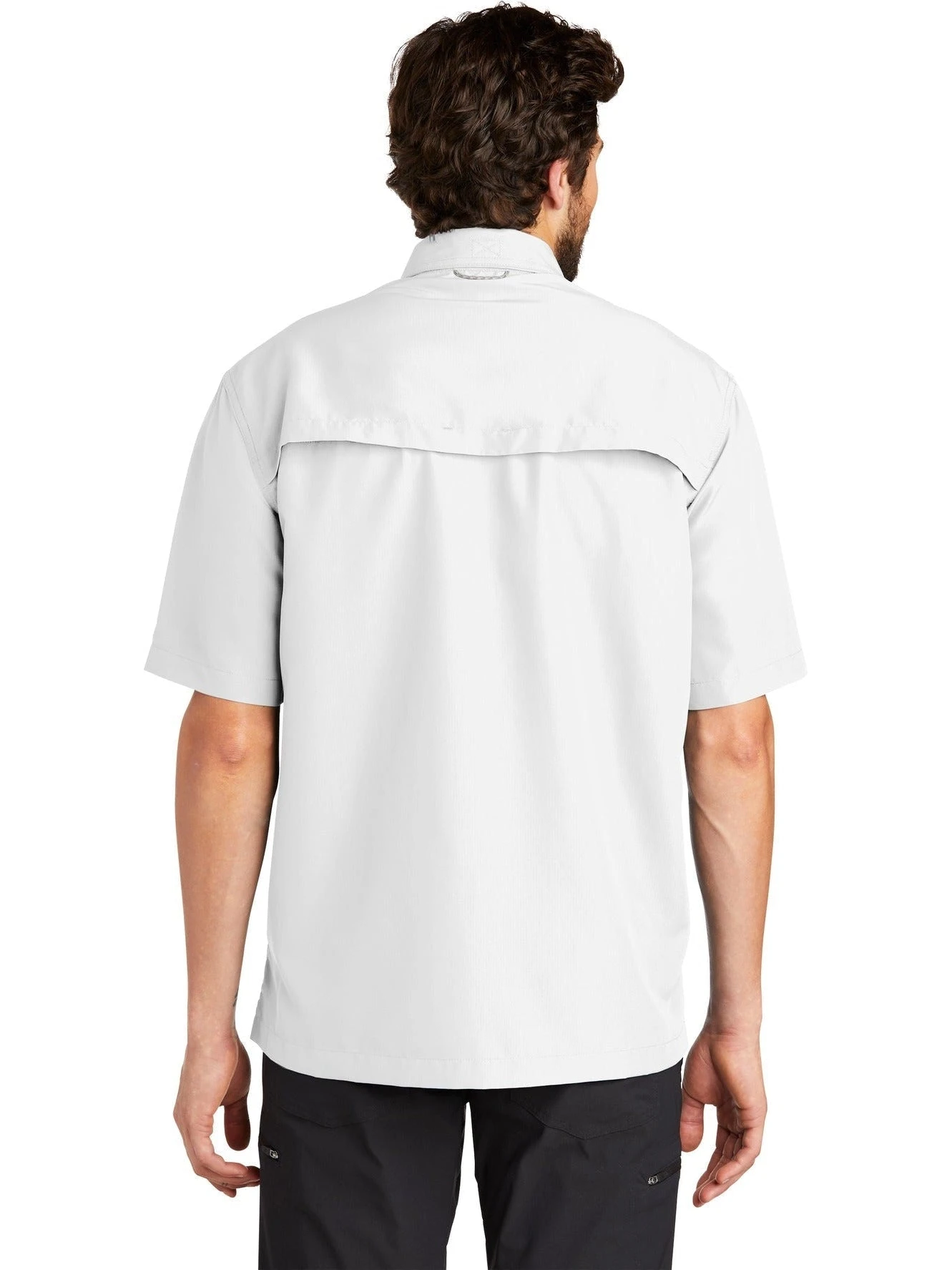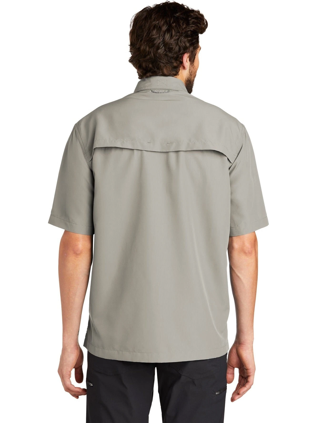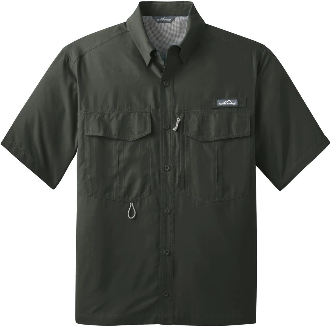 The Eddie Bauer Short Sleeve Performance Fishing Shirt is a semi-tailored men’s work shirt made of a resilient yet incredibly comfortable lightweight 100% polyester ripstop fabric. The squared construction of this sleek garment is complemented by a 100% polyester mesh upper back lining and a Cape back with a mesh ventilation panel, which guarantees ease even during the hottest of days. All stitching is durable and neat.
