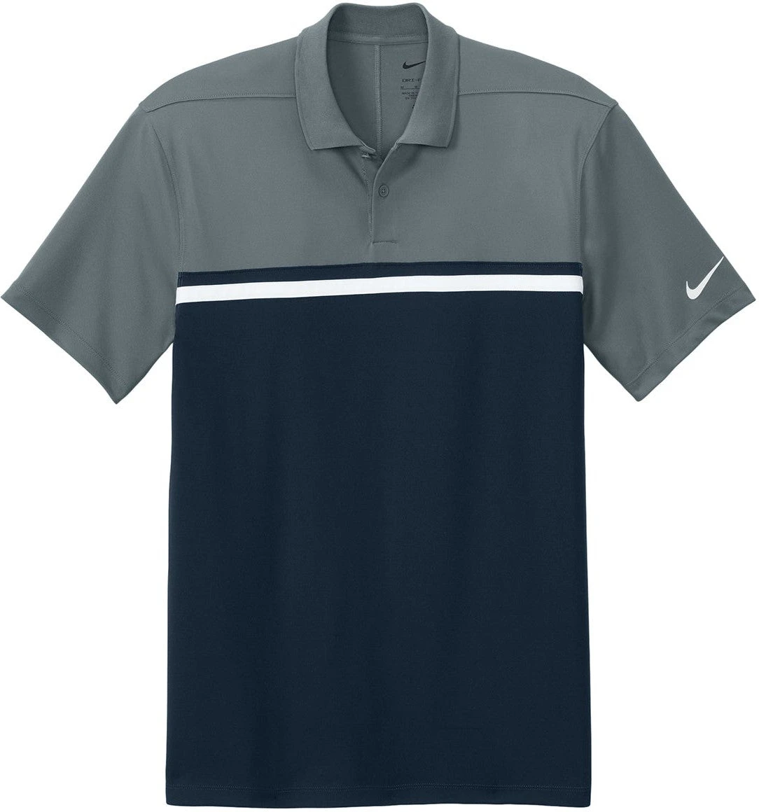 Built from at least 75% recycled polyester fabric, Nike scores a sustainable victory with this polo that stands out with colorblocking on the front and Dri-FIT moisture management technology. Details include an anti-curl flat knit collar, two-button placket with dyed-to-match buttons and rolled-forward shoulder seams for easy movement. A contrast heat transfer Swoosh is on the left sleeve. Made of 4-ounce, 100% polyester Dri-FIT fabric.**