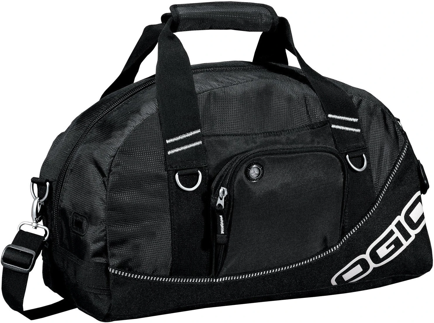 Sized to fit the gym locker, this duffel opens wide to reveal a roomy interior that holds shoes and a change of clothes.|