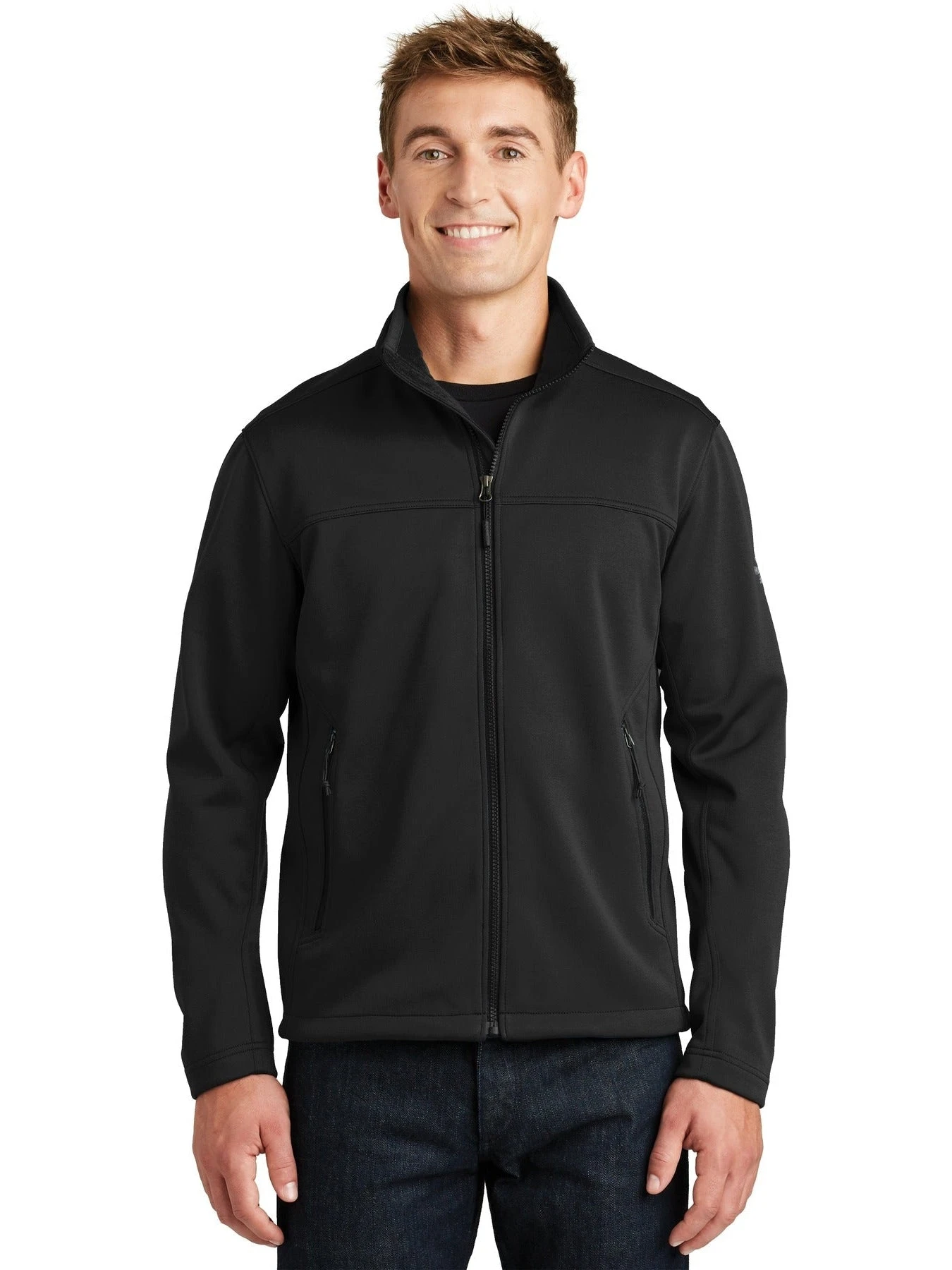 This jacket is made of 100% polyester material, and the North Face Logo is embroidered on the left sleeve and right back shoulder. We can customize this soft shell jacket by embroidering your company’s logo as well. This piece runs true to size.