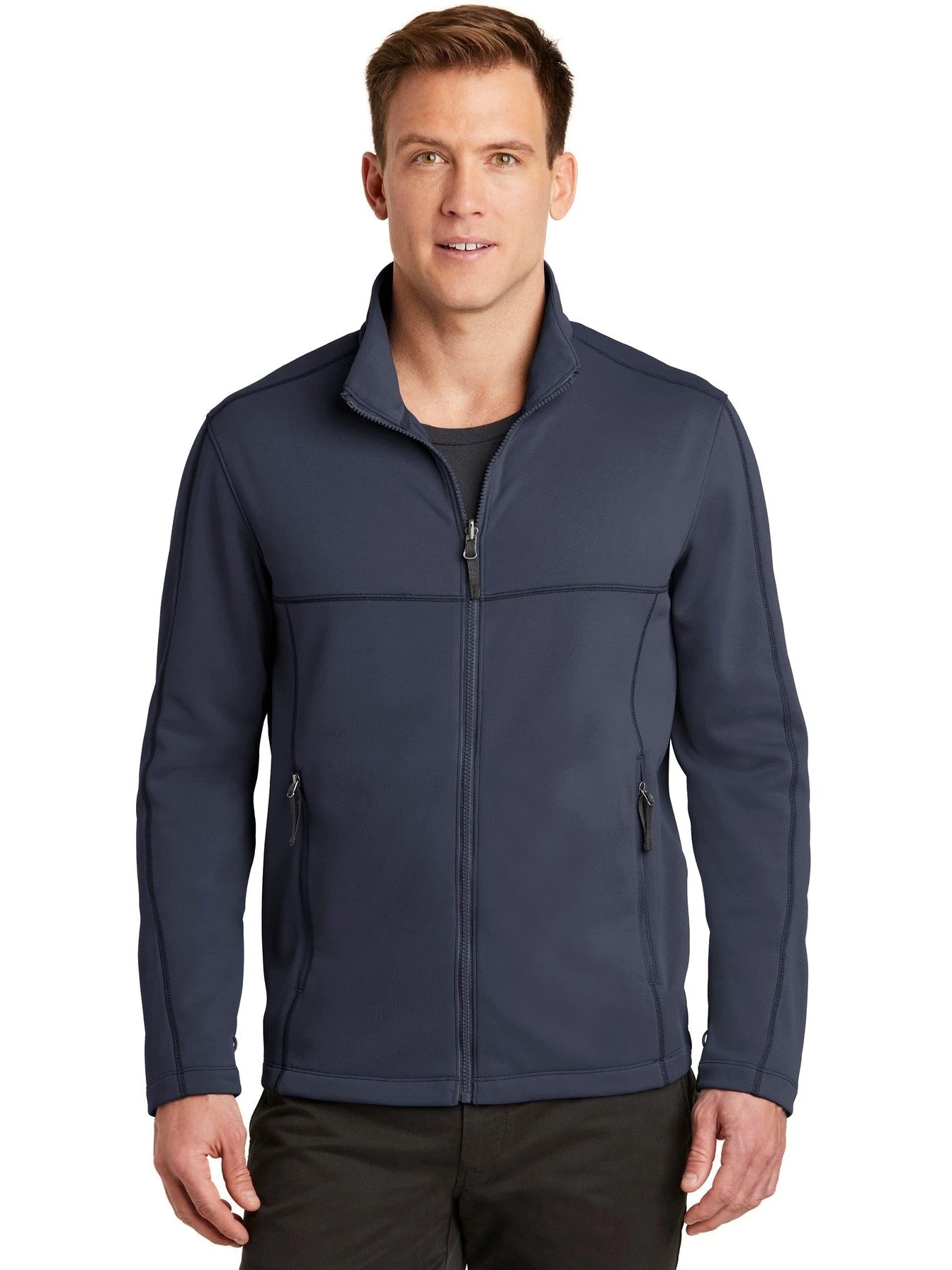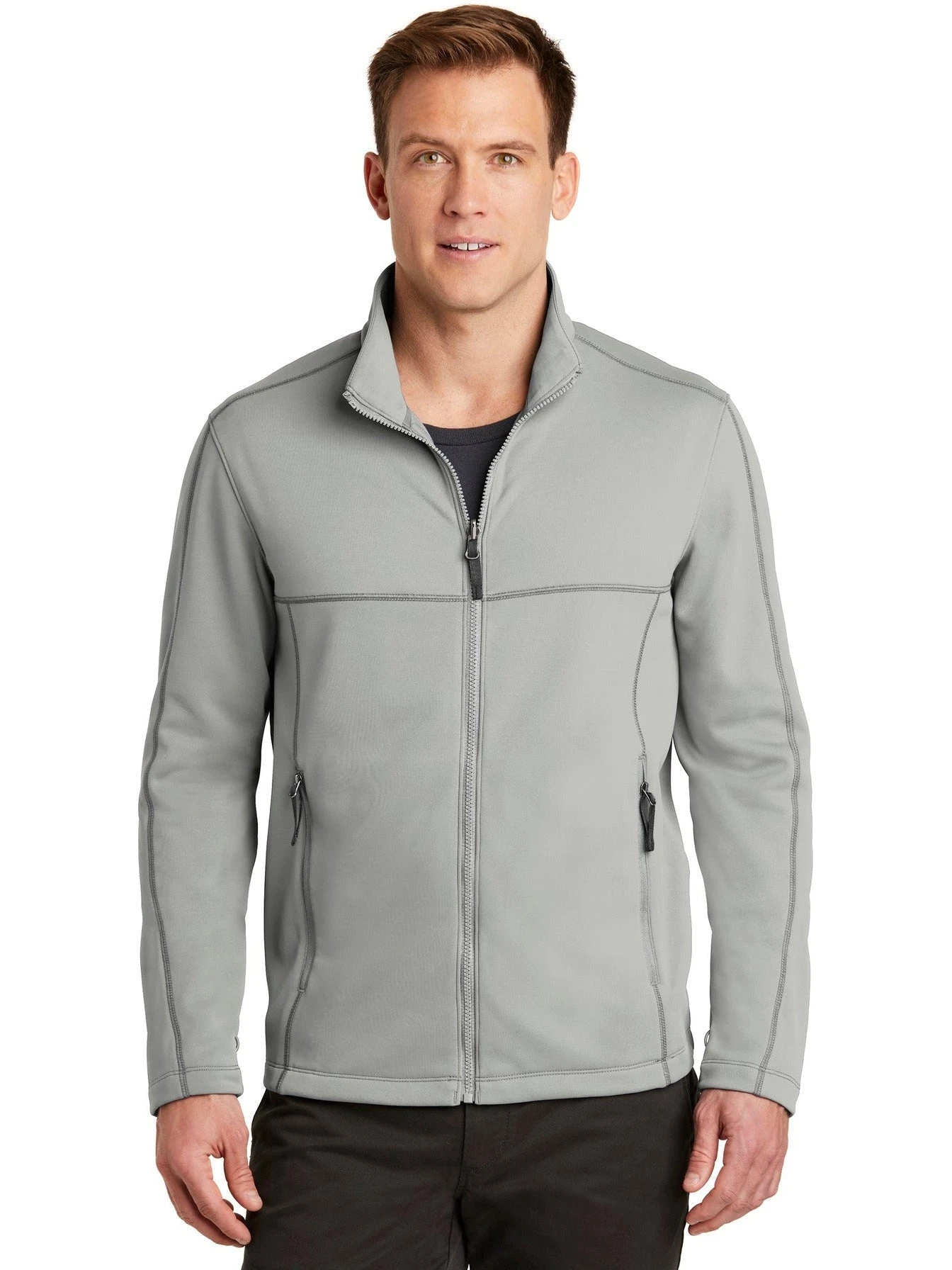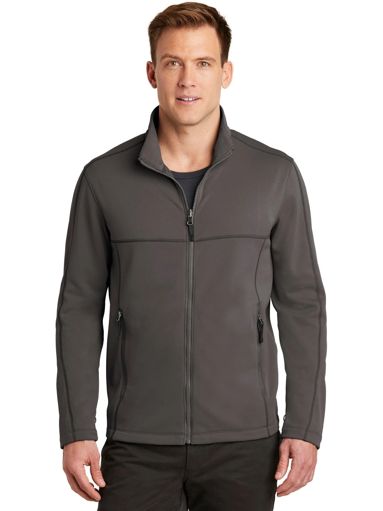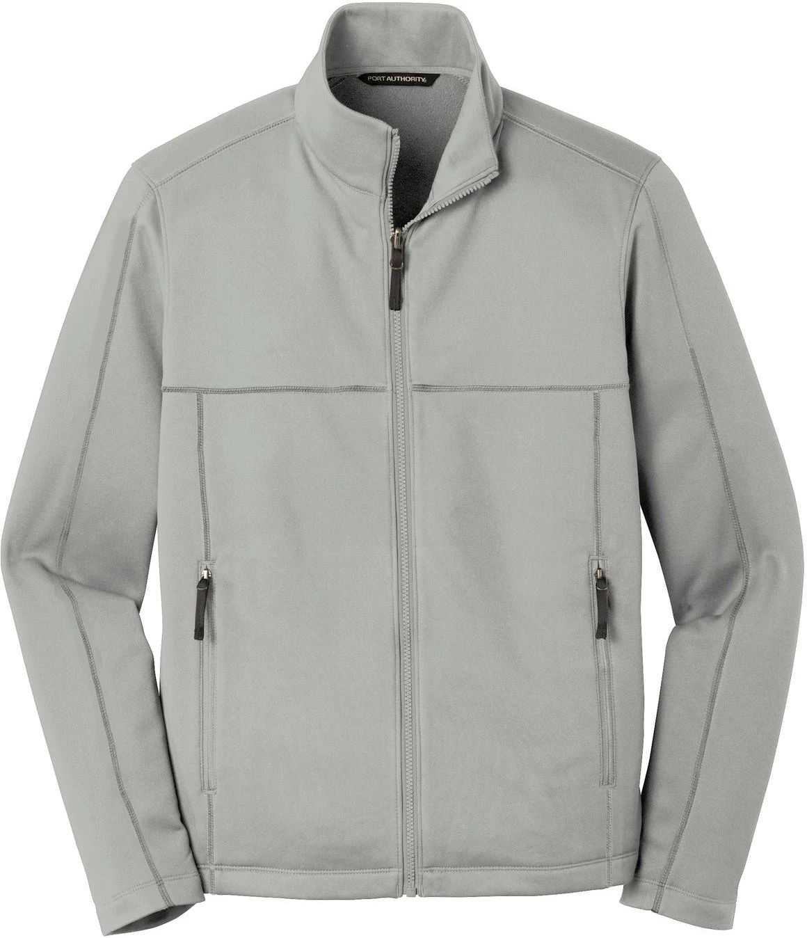 This Port Authority Collective Smooth Fleece Jacket is made out of 100% polyester fleece material. The jacket has a zip-through cadet collar and is made with a slightly longer length. The jacket can be customized to represent your brand or company by adding an embroidered name or logo. The jacket runs true to size and is available in grey and black colors.