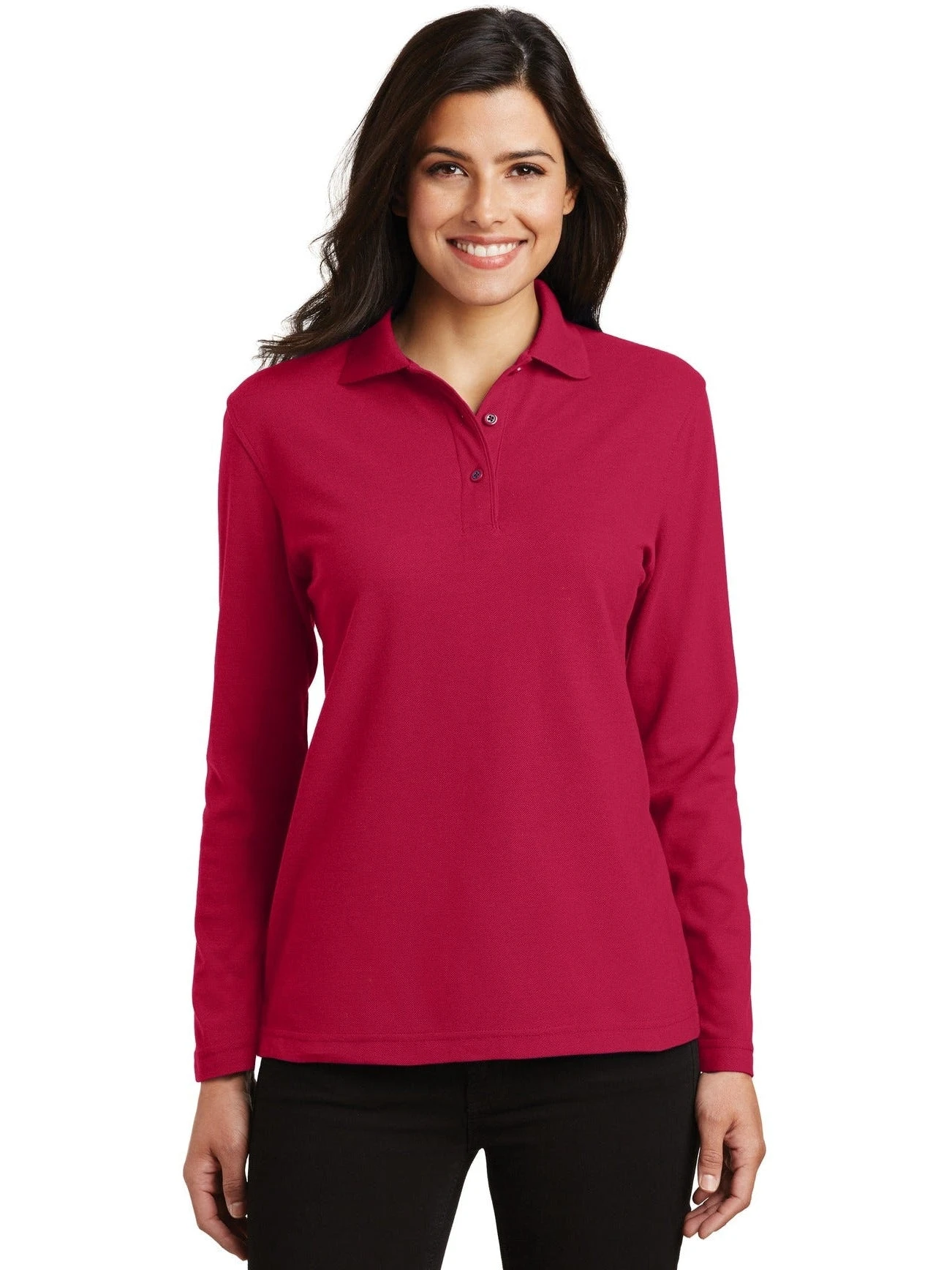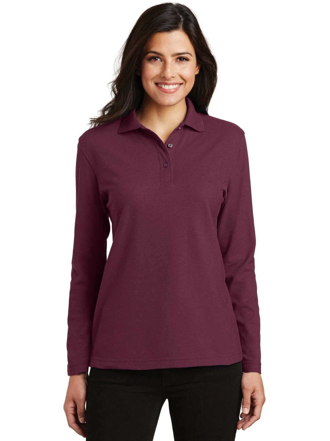 This Port Authority Ladies Long Sleeve Silk Touch Polo Shirt is made of a 65/35 poly/cotton material. The shirt is stylish, tailored for a feminine fit and it resists wrinkles. The shirt can be customized to represent your company or brand by adding an embroidered name or logo to the front of the shirt. This ladies polo shirt runs true to size.