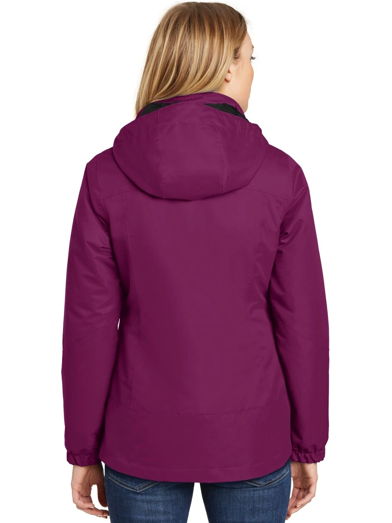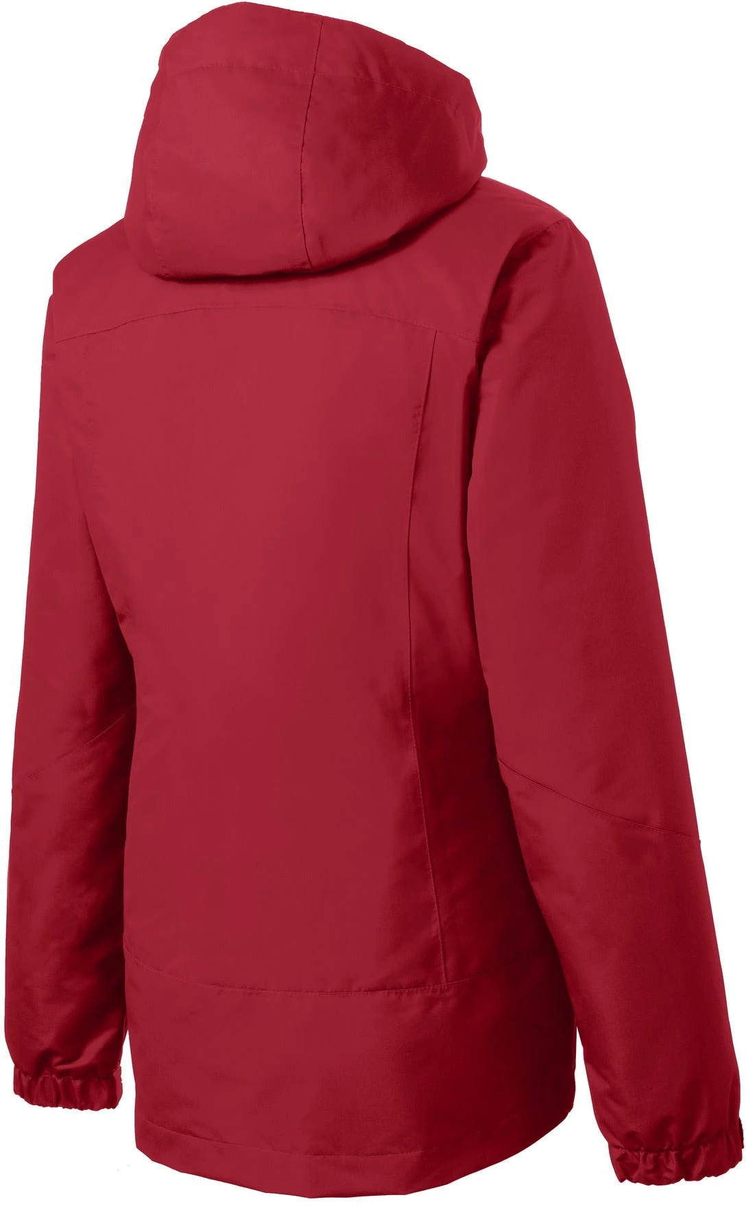This Port Authority Ladies Vortex Waterproof 3 in 1 Jacket is great for staying warm in the cold and rainy weather. The jacket features an insulated shell made out of one hundred percent polyester and uses one hundred percent nylon as an inner material. The jacket is waterproof and has a protective hood. The jacket is available in several colors and runs true to size.