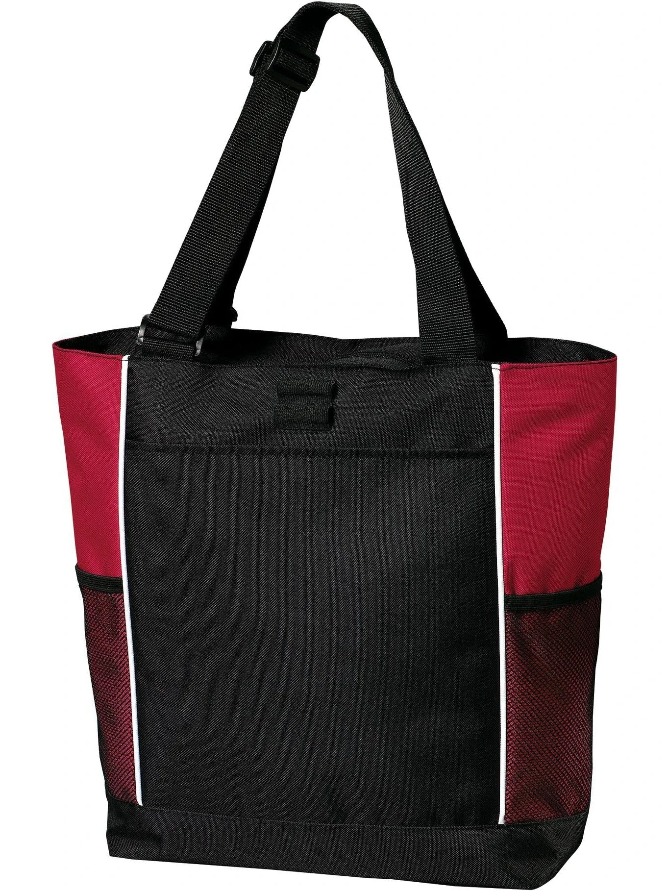 This tote has a secure zippered top and adjustable webbing handles for easy carrying.