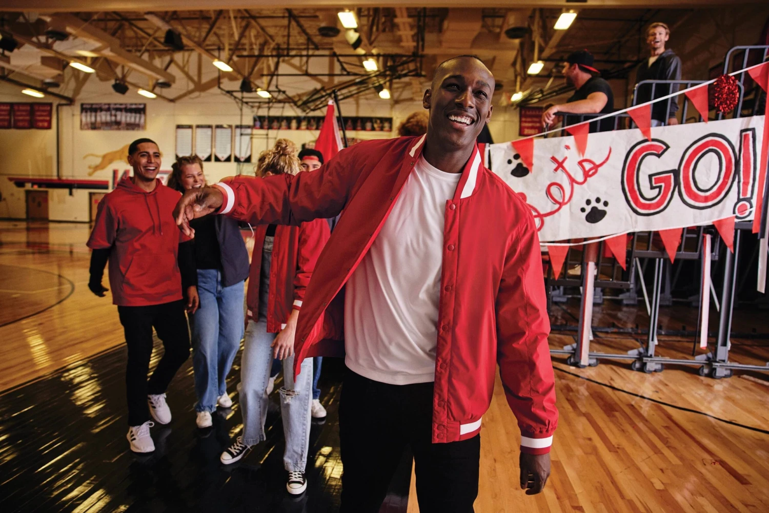 Show your team spirit in this retro-inspired jacket that offers weather-fighting protection. 100% polyester with water-resistant coating2.4-ounce polyfill insulation in body1.8-ounce polyfill insulation in sleevesTag-free labelDyed-to-match metal snap closureLocker loopFront welt pocketsDecoration access pocket1x1 striped rib knit at collar, cuffs and hem