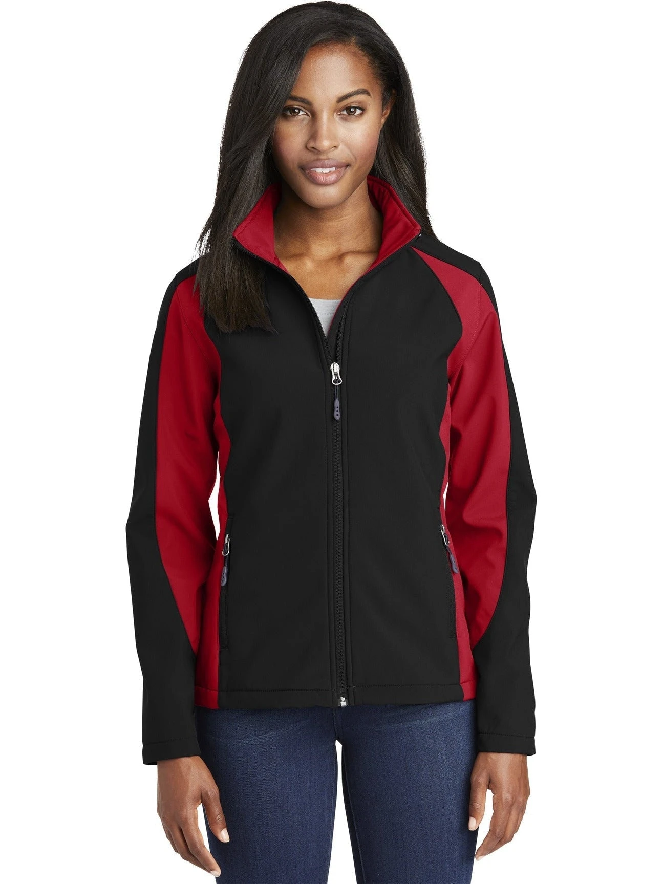 This Sport-Tek Ladies Colorblock Soft Shell is highly functional and will protect you in through the weather. The jacket features a fully zippered front and zippered side pockets on either side. It features a one hundred percent polyester woven shell with a warm microfleece interior to keep you warm in the cooler weather. Remember when ordering that this jacket runs true to size.